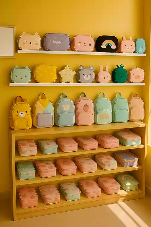 این کیف ها معمولاً کوچک، سبک و مناسب کودکان خردسال هستند که هنوز نیاز زیادی به حمل لوازم تحریر ندارند. طراحی آن ها با فرم حیوانات عروسکی، میوه ها یا اشیای بامزه انجام می گیرد که کودک را جذب خود می کند. برخی از آن ها دارای آویزهای تزئینی یا زیپ های رنگی هستند که حس بازی را در کودک تقویت می کند. این کیف ها به خاطر دسته کوتاه و وزن پایین، به راحتی توسط کودک حمل میشوند. اغلب از جنس پارچه یا فوم نرم ساخته می شوند تا به کودک آسیب نرسانند. برای مهد کودک، کلاس های پیش دبستانی و مهمانی ها بسیار مناسباند.
